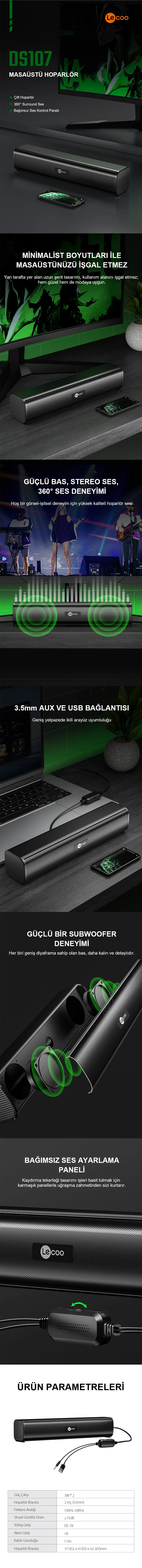 DS107, Lecoo'nun yüksek kaliteli ses deneyimini taşınabilir bir formda sunduğu kablolu soundbarıdır. İşte bu şık ve güçlü soundbarın öne çıkan özellikleri: