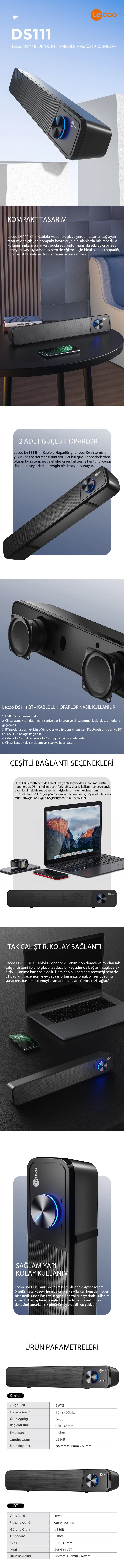 Lecoo DS111, modern ve şık siyah tasarımıyla öne çıkan bir Bluetooth hoparlör modelidir. Kompakt boyutları 38cm (U) 5cm (D) 6cm (G) ve hafif yapısı (540g) sayesinde, her yere kolayca taşınabilir. Hem iç mekânlarda hem de dışarıda kullanım için idealdir.